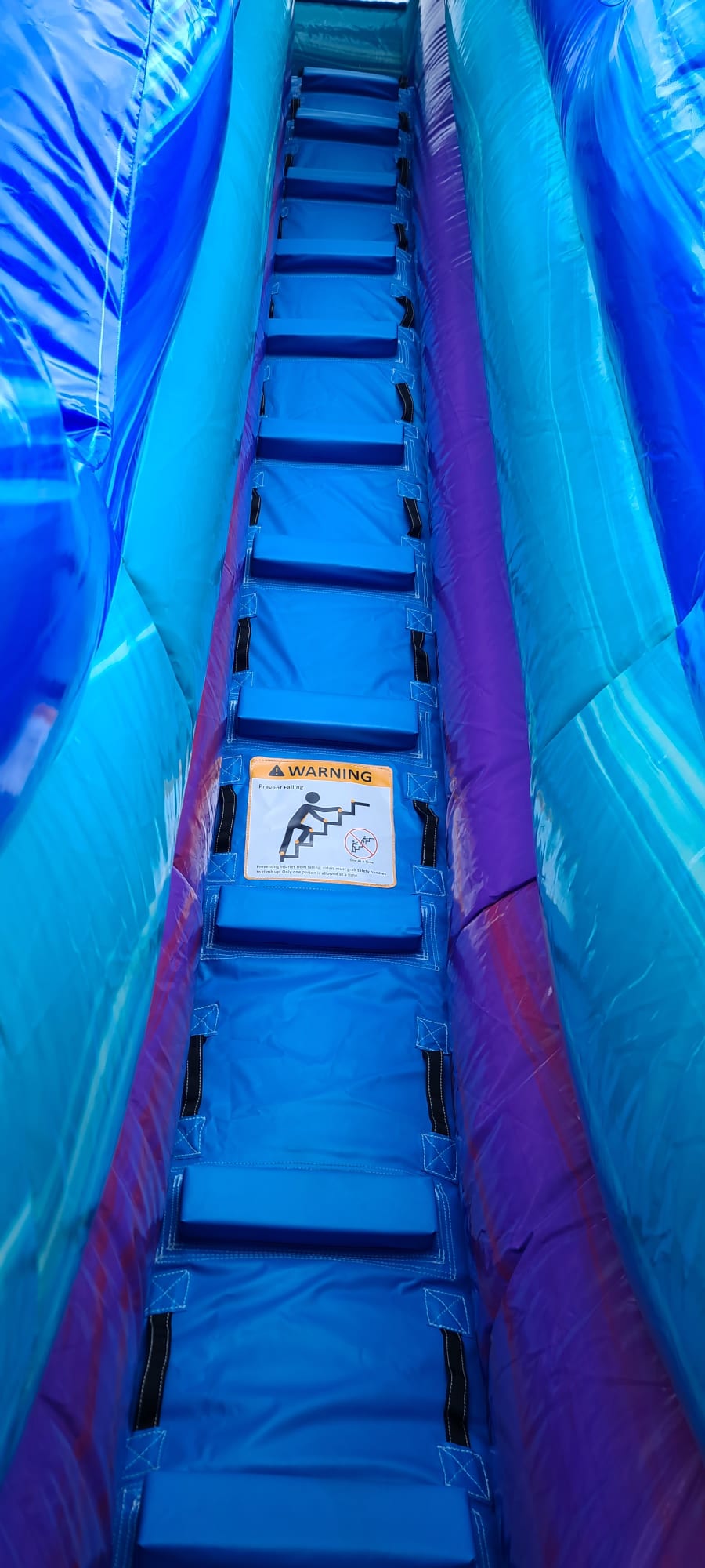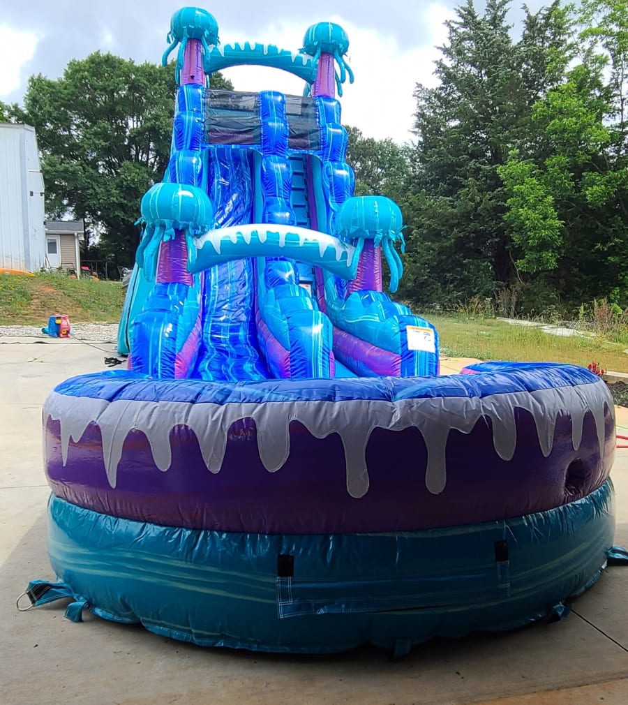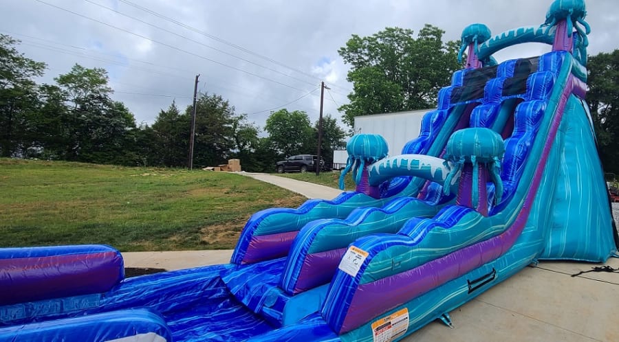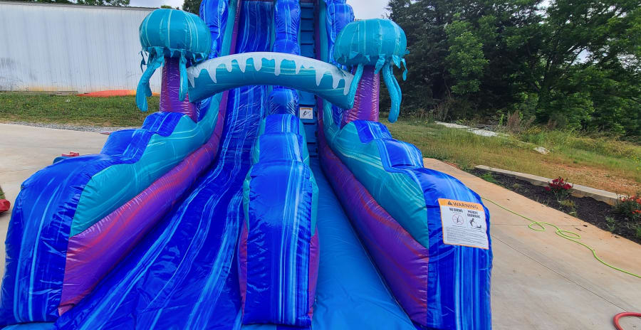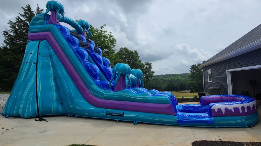 🌊 Make a splash at your next party with our 19ft Jellyfish Water Slide! 🎉 This vibrant teal slide, adorned with purple and deep blue accents and topped with adorable jellyfish, is the perfect addition to any ocean or beach themed event. 🏖️