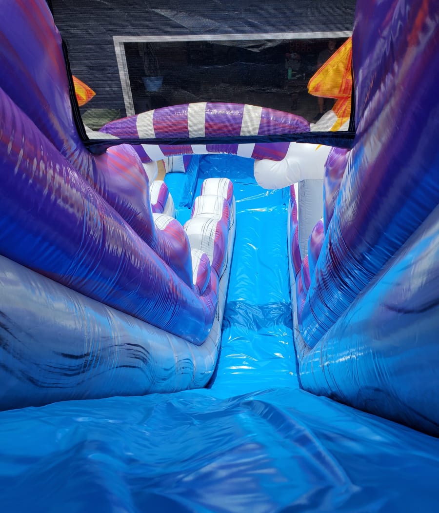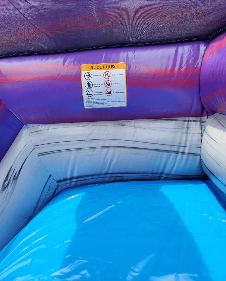 Get ready for an electrifying experience with our 19 ft Thunder Water Slide! This eye-catching inflatable slide features a vibrant purple design with pink marbling, adorned with fluffy clouds and lightning bolts. It's sure to make a big statement at your next birthday party or event. âĄ